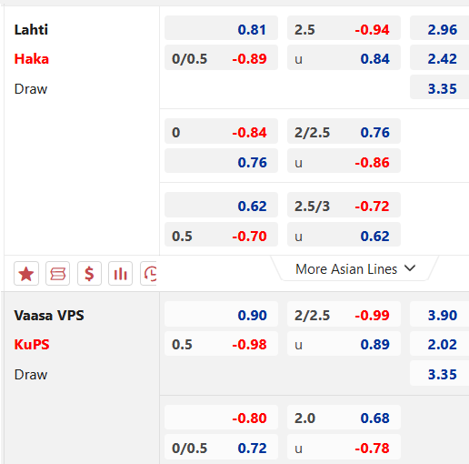Chốt kèo: Lahti +1/4 cả trận. Xỉu 2 1/2 cả trận