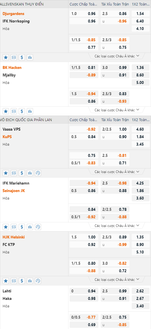 AEGoal chốt kèo bóng đá trực tiếp những trận đấu đáng chú ý trong khuôn khổ giải VĐQG Phần Lan, VĐQG Thuỵ Điển diễn ra lúc 22h30 ngày 11/06/2023 sau khi dựa trên tính toán, chuyển động về kèo châu Á và đội hình ra sân.