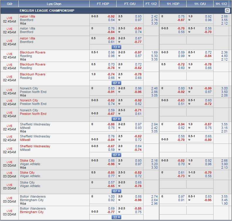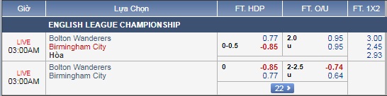 Đến sát thời điểm bóng lăn, mốc tỷ lệ chính ở cặp đấu này đã có sự hoán đổi khi Birmingham tiếp tục sắm thế cửa trên nhưng mức chấp đã được đẩy lên -1/4 cùng thang điểm ăn cũng được điều chỉnh cho phù hợp ở mức tỷ lệ này. Vốn dĩ việc Bolton bị xếp ở cửa dưới ngay trên sân nhà đã là 1 điều không tốt, vậy mà tỷ lệ cũng thay đổi với những diễn biến ủng hộ đội khách, rõ ràng càng cho thấy những hy vọng hết sức mong mạnh cho Bolton ở trận này.