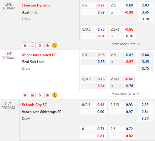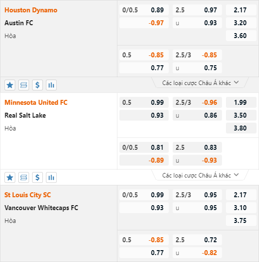 * Houston Dynamo vs Austin FC: Phong độ bất ổn nhưng Houston Dynamo lại tăng giá trận này khi từ chấp 1/4 lên thành chấp hòa. Trong bối cảnh tài xỉu vẫn là 2 1/2, dịch chuyển handicap như vậy rõ ràng là tín hiệu tích cực với Houston Dynamo.