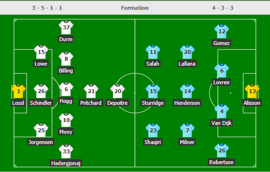 + Huddersfield: Lossl (GK), Lowe, Schindler, Zanka, Durm, Mooy, Hogg, Parra, Pritchard, Kachunga, Depotre.