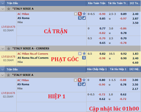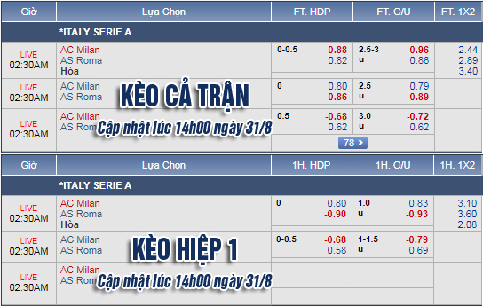 Trong khi đó, kèo tổng bàn thắng cả trận lại chứng kiến xáo trộn đáng kể so với đầu phiên. Chỉ số cởi mở 2 3/4 từ đầu phiên với điểm bỏ cho lựa chọn Tài đã được điều chỉnh lên nhận được lợi nhuận thấp hơn so với kèo khan hiếm bàn thắng. Rõ ràng, việc AC Milan chơi sơ đồ 4-3-3 với mũi nhọn Higuain rất đáng hy vọng. Bên phía đối diện cũng là đội quân chất lượng đến từ thủ đô với Dzeko, N'Zonzi, Pastore hay Kolarov.