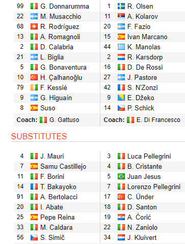 AS Roma (4-3-3): Olsen - Karsdorp, Manolas, Fazio, Kolarov - Pastore, Rossi, Cristante - Under, Dzeko, Shaarawy.