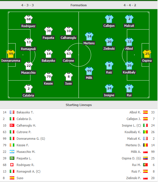 Tuy vậy thì biến động về tỷ lệ đó cũng dễ hiểu khi AC Milan không còn chân sút Higuain trong đội hình còn bên phía Napoli, họ có đầy đủ những trụ cột ở trận này, từ Insigne, Mertens đến Callejon. Trên băng ghế chỉ đạo của Napoli, HLV Ancelotti cũng đã quá hiểu AC Milan, CLB mà ông từng dẫn dắt trước đây. Với tỷ lệ và đội hình ra sân như dưới đây, người viết tin vào Napoli cùng trận cầu chặt chẽ!