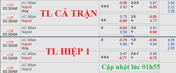 So với phiên khớp lệnh lúc 11h00 trưa ngày 26/01 thì tỷ lệ chính vẫn giữ ở mức Napoli chấp 1/4 nhưng lợi nhuận cho cửa trên của họ đã giảm nhẹ từ 0.97 về còn 0.93. Trong khi đó, mức tài xỉu lại biến động từ mốc 2 1/2 về còn 2 1/4 với điểm bỏ cho cửa xỉu. Dịch chuyển như vậy về tỷ lệ là thiếu khả quan với những ai yêu thích AC Milan và kịch bản cởi mở.