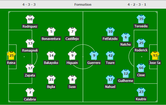 AC Milan (4-3-3): Donnarumma; Calabria, Musacchio, Romagnoli, Laxalt; Kessie, Biglia, Bonaventura; Suso, Borini, Calhanoglu.