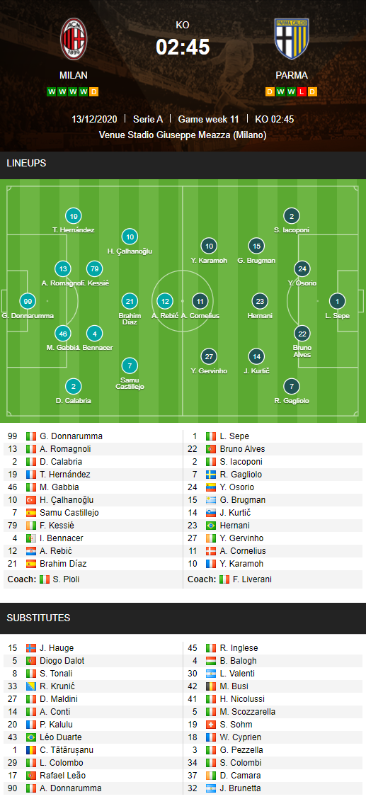 AEGoal chốt kèo bóng đá trực tiếp trận AC Milan vs Parma diễn ra lúc 02h45 ngày 14/12 trong khuôn khổ giải VĐQG Italia sau khi dựa trên tính toán, chuyển động về kèo châu Á và đội hình ra sân của 2 đội.