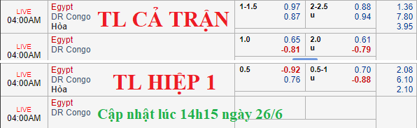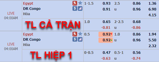 Trên thị trường châu Á, tỷ lệ chấp 1 1/4 của đội chủ nhà Ai Cập vẫn được duy trì cho tới thời điểm này, mức điểm của cửa trên đã được điều chỉnh giảm đôi chút. Trong khi đó bên phía tỷ lệ tổng bàn thắng lại có nhưng thay đổi lớn, tỷ lệ chính 2 1/4 ở thời điểm chiều qua đã được nhà cái thay thế bằng tỷ lệ 2 1/2 ở thời điểm hiện tại.