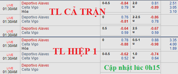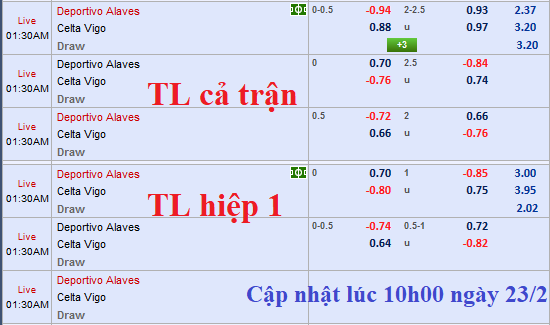 Trong khi Alaves đá với sơ đồ 4-3-3 thì Celta Vigo sử dụng chiến thuật 3-4-2-1. Về cơ bản thì đôi bên đều hướng tới mặt trận tấn công trong trận này. So với phiên khớp lệnh sáng ngày 23/02, tỷ lệ chính không có biến động nhiều khi Alaves vẫn chấp 1/4 nhưng lợi nhuận cho cửa chủ nhà đã bỏ rất sâu (từ -0.94 về -0.84). Trong khi đó, mốc tài xỉu cũng giảm từ 2 1/4 về còn 2 hòa.