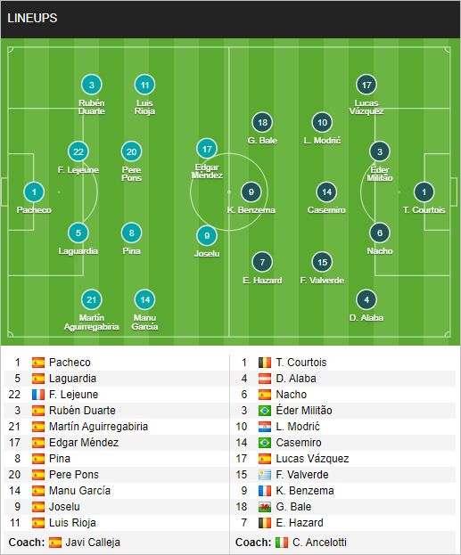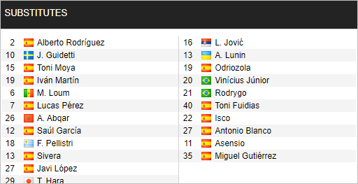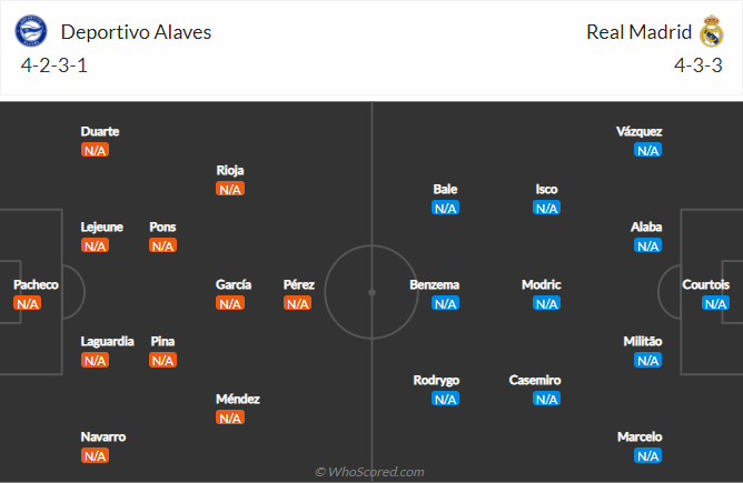 Tất cả những cái tên tốt nhất của Real Madrid đều đã có mặt ở trận này, trong đó có cả tân binh Alaba, điều đó cho thấy quyết tâm chiến thắng rất lớn của đội bóng Hoàng gia Tây Ban Nha. Và so với Alaves thì khoản lực lượng rõ ràng là hơn hẳn.