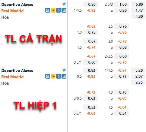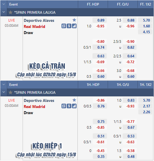 AEGoal chốt kèo bóng đá trực tiếp trận Alaves vs Real Madrid diễn ra lúc 03h00 ngày 15/8 trong khuôn khổ giải VĐQG Tây Ban Nha sau khi dựa trên tính toán, chuyển động về kèo châu Á và đội hình ra sân của 2 đội.