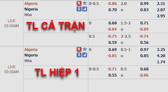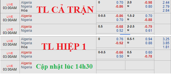 Tỷ lệ của trận đấu trên sàn giao dịch châu Á gần như không có biến động nào kể từ thời điểm chúng tôi cập nhật chiều hôm qua. Algeria vẫn đang được đánh giá ở cửa trên với tỷ lệ chấp 1/4 cho trận đấu này. Ở bên phía tỷ lệ tài xỉu của trận đấu cũng tương tự, mức tỷ lệ 2 hoà vẫn là tỷ lệ chính của trận đấu, mức điểm ăn của cửa xỉu có tăng đôi chút so với chiều qua.