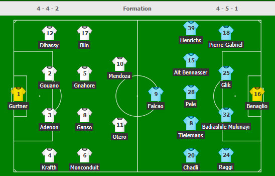Monaco (4-3-1-2): Benaglio; Jemerson, Henrichs, Raggi, Gabriel; Chadli, Tielemans, Bennasser; Diop; Sylla, Falcao.