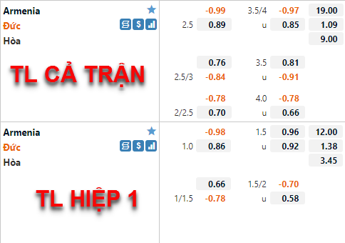 Tỷ lệ chấp của ĐT Đức có xu hướng giảm thời gian vừa qua. Hiện tại tỷ lệ chấp chính cùa đội khách được duy trì ở mức 2 1/4 trong khi ở lần chúng tôi cập nhật trước con số này là 2 1/2. Tỷ lệ tài xỉu của trận đấu ít có biến động hơn khi mốc 3 3/4 vẫn được duy trì mốc chính của trận đấu, điểm ăn của cửa tài được điều chỉnh giảm nhưng không nhiều.