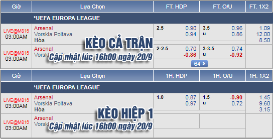AEGoal.net chốt kèo trực tiếp trận Arsenal vs Vorskla Poltava sau khi dựa trên tính toán, chuyển động về kèo châu Á và đội hình ra sân của 2 đội.