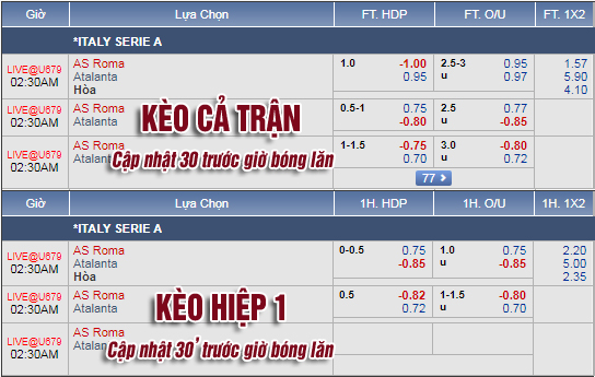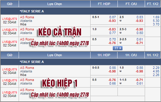 * Chốt kèo trận AS Roma vs Atalanta (01h30)
