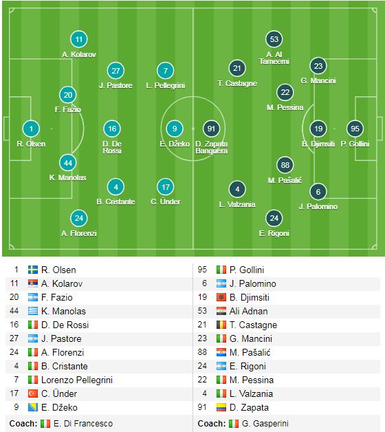 AS Roma (4-3-3): Olsen - Kolarov, Fazio, Manolas, Florenzi - Strootman, Rossi, Pastore - Shaarawy, Dzeko, Under.