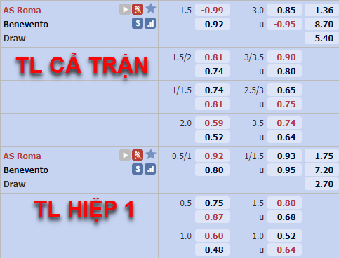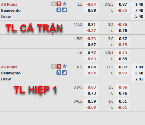 Trên thị trường châu Á thời điểm hiện tại, mức chấp của đội chủ nhà AS Roma vẫn được giữ ở mức 1 1/2 điểm ăn của cửa trên được điều chỉnh giảm nhưng không nhiều. Trong khi đó mốc tài xỉu chính của trận đấu đã được nhà cái kèo từ mốc 3 hoà trước đây lên 3 1/4 ở thời điểm hiện tại.