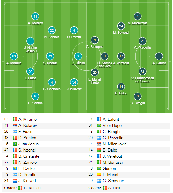 Đã có khá nhiều sự thay đổi trong đội hình ra sân của AS Roma ở trận này khi lần lượt những De Rossi, Pellegrini, Olsen, Uner hay Schick phải ngồi dụ bị ở trận này, với những thiếu vắng ấy, rõ ràng hy vọng cho thầy trò HLV Ranieri ở trận này là không nhiều. Trong khi đó, ngoại trừ trường hợp của Chiesa ra sân trên ghế dự bị thì Fiorentina vẫn có được những con bài tốt nhất trên sân.