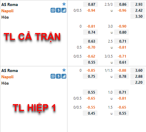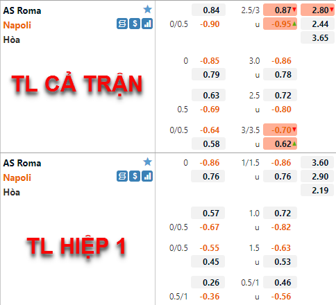 AEGoal chốt kèo bóng đá trực tiếp trận AS Roma vs Napoli diễn ra lúc 23h00 ngày 24/10 trong khuôn khổ giải VĐQG Italia sau khi dựa trên tính toán, chuyển động về kèo châu Á và đội hình ra sân của 2 đội.