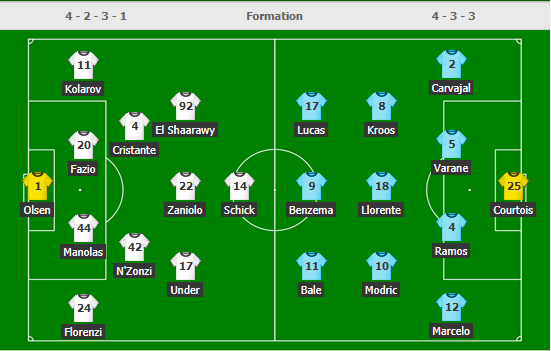 Đội hình ra sân của AS Roma bất ngờ có cái tên còn khá lạ lẫm với NHM là Zaniolo trong khi bên phía Real, Isco còn không có tên trong danh sách đăng ký và Llorente chơi ở trung tâm hàng tiền vệ. Real vẫn đang trong giai đoạn bất ổn và thất bại thảm hại trên sân của Eibar cuối tuần qua chắc chắn ảnh hưởng không nhỏ đến tinh thần của họ. Còn AS Roma, họ luôn chơi tốt tại Olimpico và đừng quên họ từng đánh bại Liverpool và Barca tại đây.