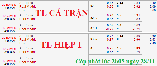 Real Madrid vẫn giữ được mức chấp hòa so với phiên khớp lệnh lúc 15h00 chiều 27/11 nhưng điểm ăn cho họ vẫn ở mức bỏ khá sâu. Về cơ bản handicap không có dịch chuyển đáng kể nhưng mức tài xỉu thì có chút biến động khi mức 3 hòa được kéo lên thành 3 1/4 và điểm ăn cho cửa tài ở mức thấp.