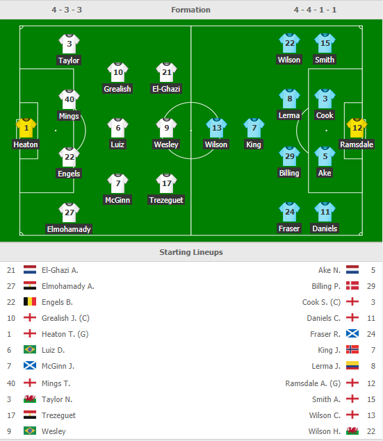 *Aston Villa: James Chester, Kortney Hause, Jonathan Kodjia vắng mặt do chấn thương. Frederic Guilbert nhiều khả năng sẽ không được đá chính. Matt Targett, Jota được hy vọng sẽ có mặt trong đội hình ngày tư đấu.