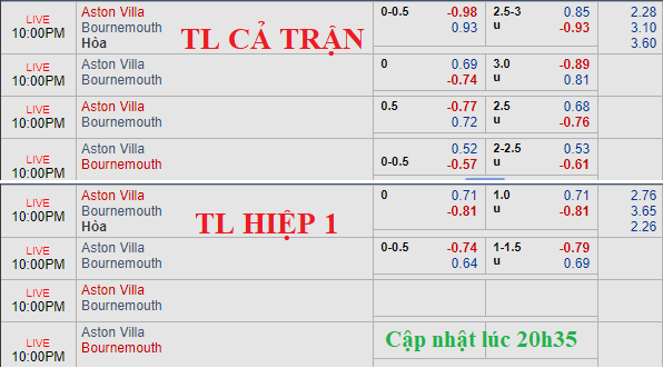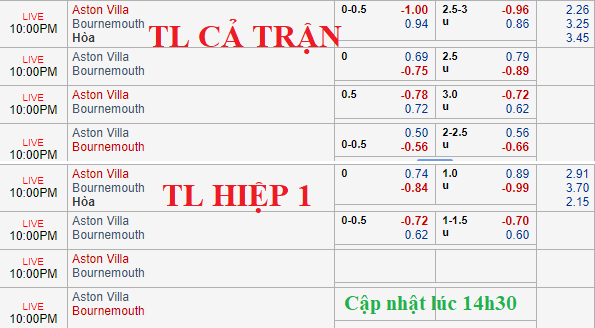 So với thời điểm ban đầu, Aston Villa tăng giá khi kèo 0:0 được nâng lên thành chủ chấp 1/4. Trong khi mốc tài xỉu dù vẫn là 2 3/4 nhưng lợi nhuận cho cửa tài giảm khá mạnh.