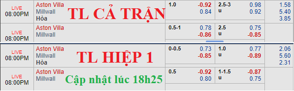 So với thời điểm sáng nay, tỷ lệ chính không có dịch chuyển đáng kể khi Aston Villa vẫn chấp 1 hòa, dẫu vậy thì điểm ăn cho họ lại có xu hướng bỏ sâu hơn (từ -0.98 thành -0.92 lúc 16h25). Mốc tài xỉu 2 3/4 cũng chứng kiến điểm ăn cho cửa tài tăng từ 0.87 lên thành 0.98.