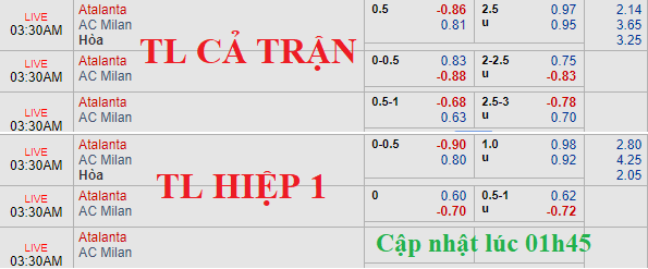Nếu so với thời điểm 10h00 sáng ngày 16/02 thì mức handicap không có dịch chuyển quá nhiều khi Atalanta vẫn chấp hòa với điểm bỏ khá sâu (-0.86) và mốc tài xỉu cũng chứng kiến điểm ăn cho cửa tài tăng từ 0.86 lên thành 0.97. Về cơ bản, dịch chuyển như vậy là tín hiệu thiếu khả quan với chủ nhà.
