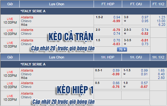 Những diễn biến mới nhất trên sàng giao dịch châu Á tiếp tục chứng kiến thế áp đảo của Atalanta trước Chievo khi mức chấp -1 3/4 vẫn đang được duy trì cho đến sát thời điểm bóng lăn, trong khi điểm ăn của đội chủ nhà cũng đã giảm. Bên cạnh đó, việc mốc tổng bàn thắng vẫn đang duy trì ở mức 3 hòa cùng điểm ăn khá cân bằng giữa 2 đầu mã giao dịch cũng đã cho thấy khả năng cỏi mở của trận đấu đang nhận được khá nhiều sự tin tưởng.