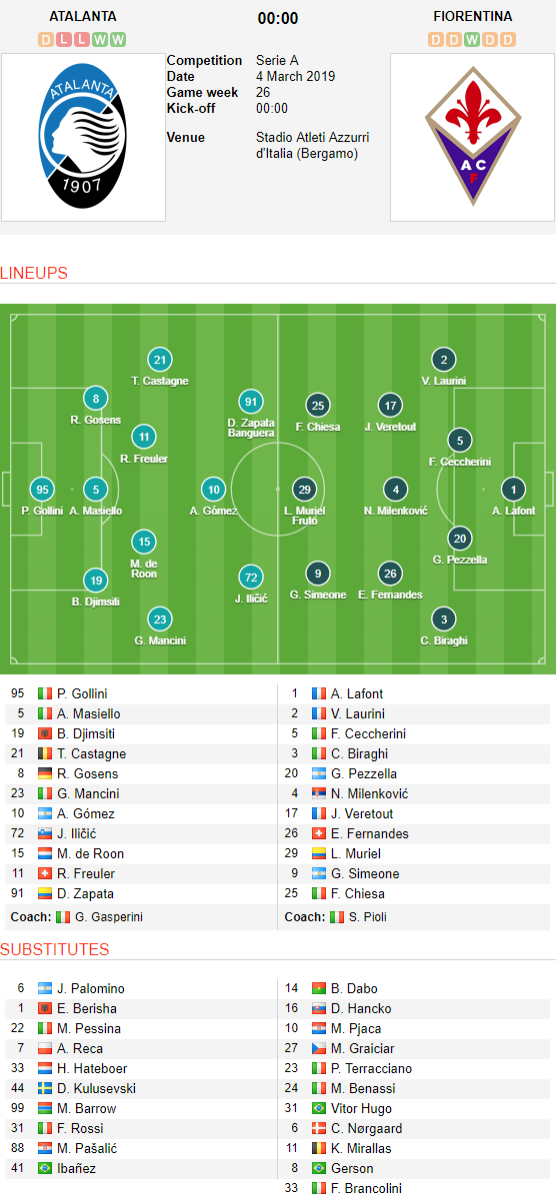 * Lần cuối cùng Atalanta thắng được Fiorentina trong khuôn khổ Serie A đã từ tháng 4/2012.