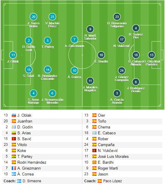Trong đội hình ra sân của 2 đội trận này, Levante tỏ rõ ý đồ muốn có điểm tại Wanda Metropolitano khi tung ra đội hình khá thấp. Trong khi đó, Atletico Madrid lại không có sự phục vụ của chân sút quan trọng Diego Costa, bên cạnh sự nghi ngờ khả năng hỗ trợ từ 2 cánh đặc biệt là cánh trái khi 2 cái tên quan trọng ở vị trí này là Lucas Hernandez và Filipe Luis đều không thể ra sân. Với những yếu tố như vậy, Atletico Madrid đang trở nên không đáng tin cậy ở trận này, trong khi khả năng cho 1 trận cầu cởi mở cũng bị nghi ngờ.