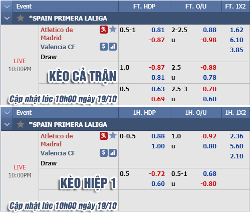 AEGoal.net chốt kèo trực tiếp trận Atletico Madrid vs Valencia diễn ra lúc 21h00 ngày 19/10 sau khi dựa trên tính toán, chuyển động về kèo châu Á và đội hình ra sân của 2 đội.