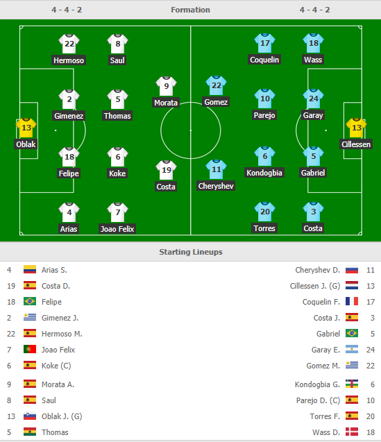 - Atletico Madrid: Stefan Savic chưa kịp bình phục. Vrsaljko chấn thương dài hạn. Khả năng ra sân của Vitolo còn bỏ ngỏ.