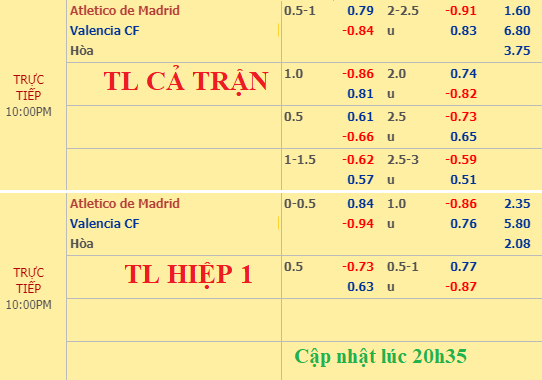 Atletico Madrid vẫn chấp 3/4 như phiên khớp lệnh lúc 10h sáng nay và điểm ăn cho cửa trên của họ giảm nhẹ. Điều đáng nói là mốc tài xỉu dù vẫn là 2 1/4 nhưng điểm ăn cho cửa tài từ 0.88 lên mức bỏ khá sâu (-0.91).
