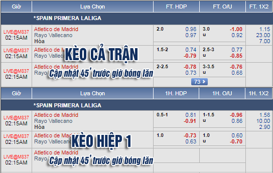 Trên thị trường châu Á, mặc dù thang điểm ăn đang có những dịch chuyển khá bất lợi với Atletico Madrid khi có phần tăng lên trong phiên giao dịch ngày hôm nay, và giảm điểm ở chiều ngược lại, tuy nhiên những biến động này là không đáng kể và vẫn tạo được sự cân bằng giữa 2 đầu mã giao dịch, trong khi mức chấp 2 hòa vẫn được giữ nguyên cho thấy niềm tin với đội chủ nhà vẫn là rất lớn.