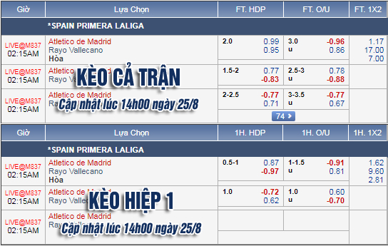 * Chốt kèo trận Atletico Madrid vs Vallecano (01h15 ngày 26/8)