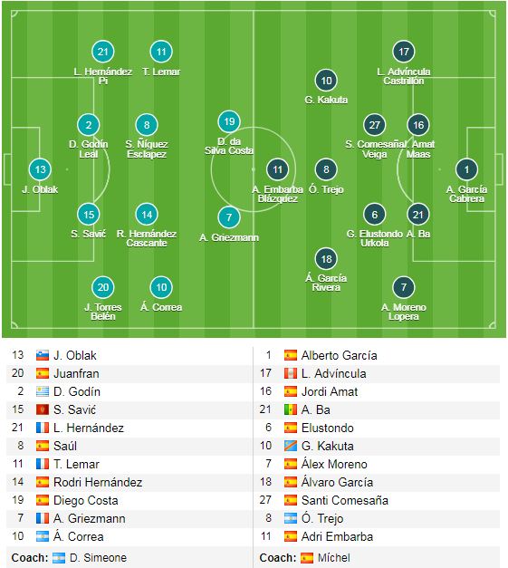 Không có bất ngờ trong số 11 cái tên có mặt ngay từ đầu của Atletico Madrid ở cuộc tiếp đón Vallecano lần này, từ tuyến phòng ngự đến tấn công, đội bóng thành Madrid có đội hình mạnh nhất của mình. Trong khi đó, bên phía đối diện Vallecano cũng có những cầu thủ tốt nhất của mình, tuy nhiên không khó để nhận ra sự chênh lệch về trình độ giữa 2 đội bóng này khi Atletico có được những ngôi sao sáng giá, trong khi Vallecano chỉ là những cầu thủ ít tên tuổi.