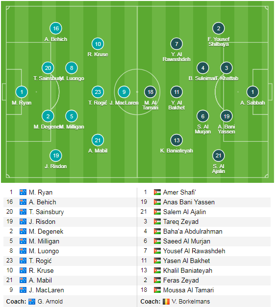 Nhìn vào đội hình ra sân của 2 đội, có thể thấy rõ sự khác biệt khi Australia chỉ có duy nhất Risdon đang chơi trong nước, tron gkhi Jordan lại chỉ có Yasen Al Bakhet và Al Tamari đang chơi ở nước ngoài. Trong đội hình ra sân của Australia, đa phần các vị trí đều là những cái tên tốt nhất, còn Jordan lại đặt nhiều hy vọng vào sao trẻ Al Tamari, cầu thủ mới chỉ 21 tuổi và đang chơi cho APOEL.