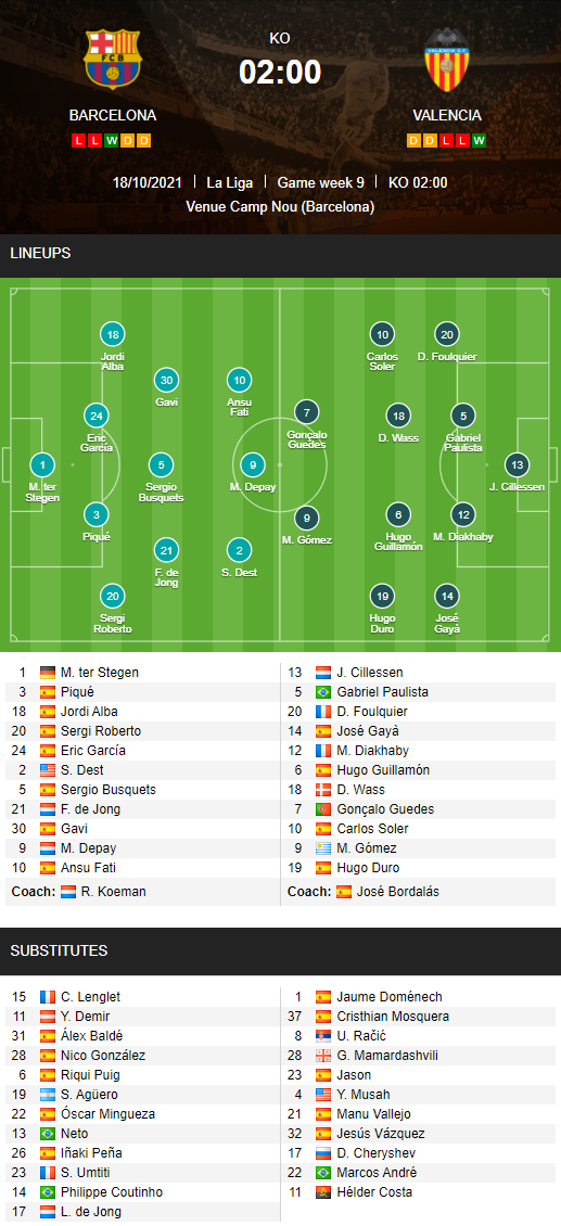 AEGoal chốt kèo bóng đá trực tiếp trận Barcelona vs Valencia diễn ra lúc 02h00 ngày 18/10 trong khuôn khổ giải VĐQG Tây Ban Nha sau khi dựa trên tính toán, chuyển động về kèo châu Á và đội hình ra sân của 2 đội.