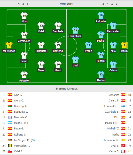 HLV Valverde gây bất ngờ khi xếp Boateng đá cao nhất trên hàng công, bên cạnh Messi và Dembele. Ngoài ra thì tiền vệ trẻ Alena và trung vệ Vermaelen cũng được ra sân ngay từ đầu. Có thể hiểu được quyết định cất một vài nhân tố chủ chốt của Valverde để giữ sức cho họ trong chuyến làm khách trước Lyon vào giữa tuần tới tại Champions League.
