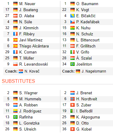 Bayern Munich (4-1-4-1): Neuer - Alaba, Hummels, Sule, Kimmich - Martinez - Ribery, Alcantara, Muller, Robben - Lewandowski.