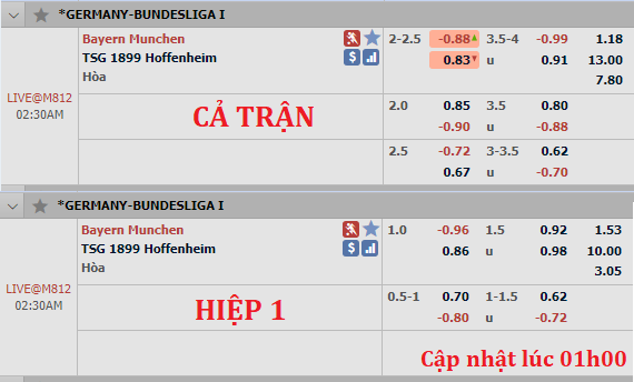 Bayern sau quá trình bứt phá mạnh mẽ trên sàn giao dịch châu Á khi kéo từ tỷ lệ chấp 1 3/4 ban đầu lên chạm mốc chấp 2 1/4. Đến sát giờ bóng lăn, sau khi có đầy đủ đội hình ra sân của mỗi đội, Hùm xám lại bất ngờ lao dốc với tỷ lệ chấp 2 1/4 bỏ rất sâu, đồng thời kèo chấp 2 hòa dần trở thành kênh khớp lệnh chủ đạo.