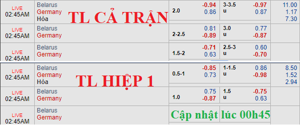 So với phiên khớp lệnh đầu giờ chiều ngày 08/06 thì Đức vẫn duy trì được kèo chấp 2 hòa, nhưng lợi nhuận cho họ đã dịch chuyển từ mức -0.95 về còn 0.86, đây là tín hiệu cho thấy Đức nhận được nhiều niềm tin từ giới đầu tư. Mức tài xỉu cũng được kéo từ 3 hòa lên thành 3 1/4 với điểm bỏ đôi chút cho cửa tài.