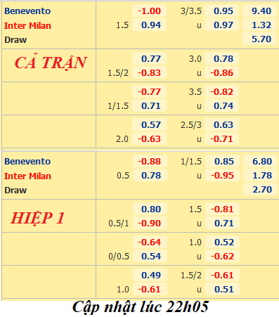 AEGoal.net chốt kèo bóng đá trực tiếp trận Benevento vs Inter Milan diễn ra lúc 23h00 ngày 30/09 trong khuôn khổ giải VĐQG Italia sau khi dựa trên tính toán, chuyển động về kèo châu Á và đội hình ra sân của 2 đội.