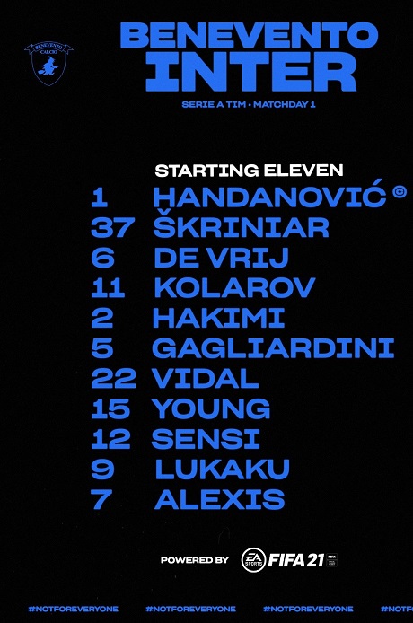 Inter: Handanovic; Skriniar, De Vrij, Kolarov; Hakimi, Vidal, Gagliardini, Young; Sensi; R Lukaku, Alexis Sanchez