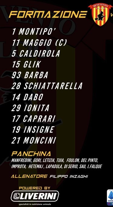 Benevento: Montipò; Maggio, Glik, Caldirola, Barba; Ionita, Schiattarella, Dabo; R Insigne, Caprari; Moncini.