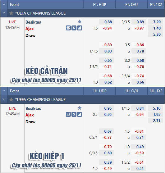 * Chốt kèo trận Besiktas vs Ajax (00h45 ngày 25/11)