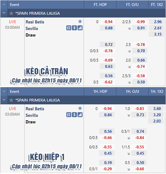 * Chốt kèo trận Betis vs Sevilla (03h00 ngày 08/11)
